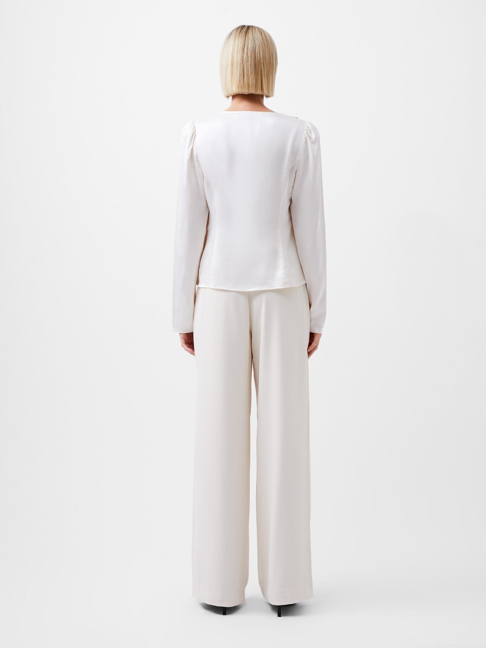 Indulge in luxury with the Ennis Satin Lace V-Neck Blouse. Designed with long sleeves and self-covered buttons. this blouse exudes elegance and sophistication. The delicate lace trim adds a touch of femininity. making it the perfect choice for any formal or special occasion.